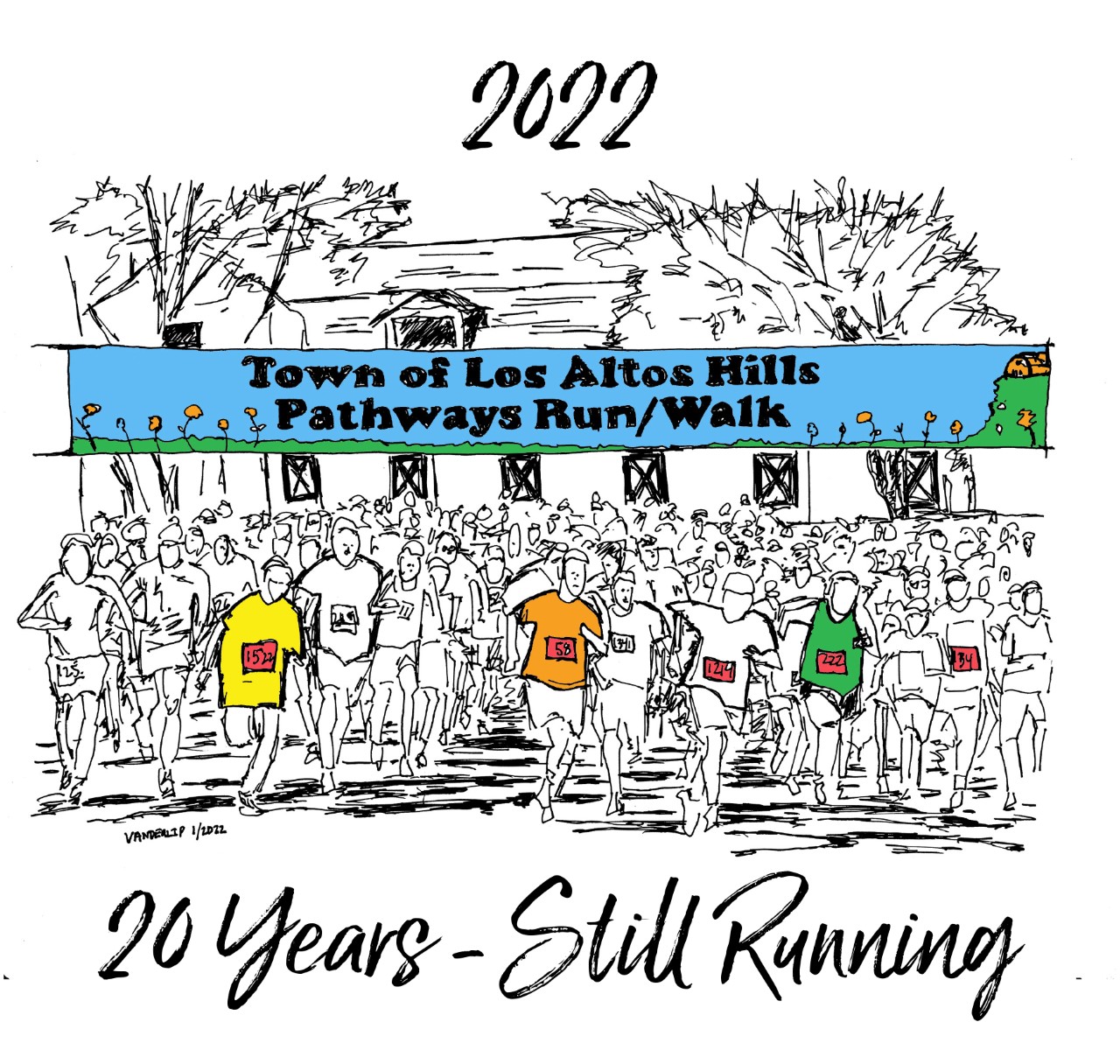 Local Los Altos Hills artist and avid runner Scott Vanderlip has created several of the logos used for the pathways run for the past 20 years. He enjoys combining, art, humor, community, environmental messages, and exercise into the run theme shirts and is happy to personally sign your shirt at the race!